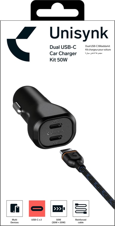 Unisynk 50W dual USB-C biloplader-sættet tilbyder hurtig dobbelt opladning med 30W og 20W output, universel kompatibilitet og inkluderer et holdbart 1 meter flettet kabel til problemfri strøm på farten.Læs mere om produktet