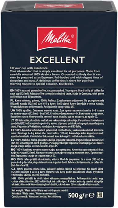 Melitta Excellent malet kaffe 485 er fremstillet af 100 % omhyggeligt udvalgte arabica-bønner, fintmalet til alsidig brug, herunder espresso. Den har en fyldig smag med elegante noter af chokolade og nødder.Læs mere om produktet