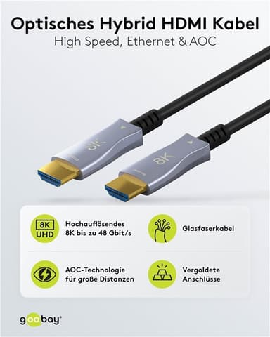 Det optiske HDMI™-kabel er ideelt til at bygge bro over afstande på op til 100 m og giver dermed betydeligt mere fleksibilitet og højere transmissionshastigheder end et konventionelt kobberkabel.