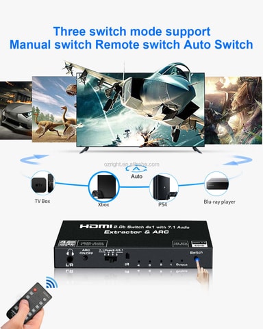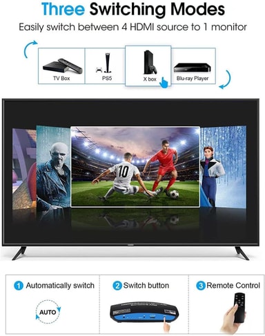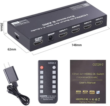 NÖRDIC 4 til 1 HDMI-switch med IR-fjernbetjening giver dig mulighed for at tilslutte 4 HDMI-videokilder til 1 HDMI-skærm / TV / projektor. Du kan nemt skifte med IR-fjernbetjeningen eller knappen på boksen. 18 Gbps båndbredde med seneste HDMI 2.0-specifikationer. Til normal brug af produktet skal du altid tilslutte HDMI-kontakten til strømforsyningen. Switchen kan håndtere op til 4 HDMI-indgangssignaler fra forskellige videokilder til 1 HDMI-videosignal i output, 1 port digital audio Toslink, 1 analog lyd 3,5 mm L/R oh 1 port HDMI audio: HDMI output audio og Toslink kan håndtere ARC funktion, men ikke 3,5 mm lyd analog. Kompatibel med HDR10, HDMI2.0b, HDCP2.2 / 1.471.3 / 1.2 / 1.1 Skift mellem videokilder sker med en fjernbetjening eller en knap på kontakten. HDMI-switchen understøtter lydformaterne LPCM 7.1CH, Dolby True-HD, DTS-HD, AC3, DTS, DSD. Men kan ikke afkode disse lydformater. Hvis din forstærker eller soundbar ikke kan understøtte disse lydformater, vil der ikke være lyd på din soundbar eller forstærker, så indstil lydformatet til HDMI-kilde til PCM/LPCM-lydformat. BEMÆRK: Understøtter ikke Dolby Digital Plus-lyd. NÖRDIC HDMI Switch understøtter de fleste enheder med et standard HDMI-interface. Input kompatibel med computer, Roku, Xbox 360, Xbox One, PS4 / PS5, Ps4 pro, Blu-Ray DVD, Chromecast, Nintendo Switch osv. Output kompatibel med HDTV eller fuld HD TV, projektorer, skærme osv. BEMÆRK: HDMI Switch er ikke kompatibel med DVI, brug ikke HDMI til DVI-kabel til at forbinde til din projektor/skærm. Brug AWG26 (19 + 1) standard HDMI 2.0-kabel. Produktet tændes først, derefter tilsluttes HDMI-kablet. BEMÆRK: Hvis ARC ikke virker, skal du sørge for, at ARC-funktionen på TV'et og fjernbetjeningen er tændt. Fjernbetjeningen kan ikke justere lydstyrken, bare juster lydenhedens lydstyrke.