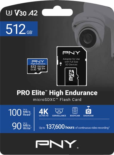 PNY PRO Elite High Endurance microSD-kort 512 GB giver hurtige læse-/skrivehastigheder på op til 100/90 MB/s. Det er perfekt til 4K-video, fotos og apps med Class 10-, U3-, V30- og A2-klassificeringer.Læs mere om produktet
