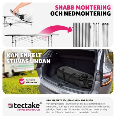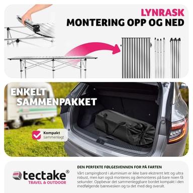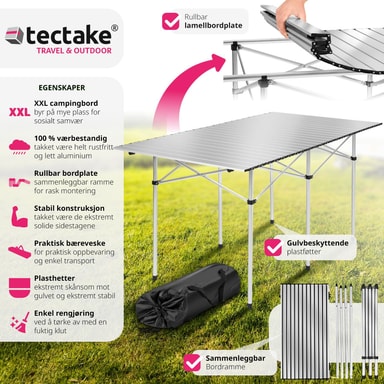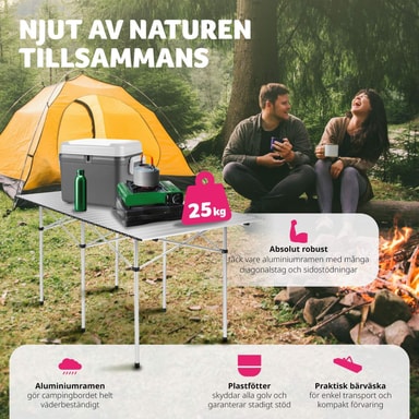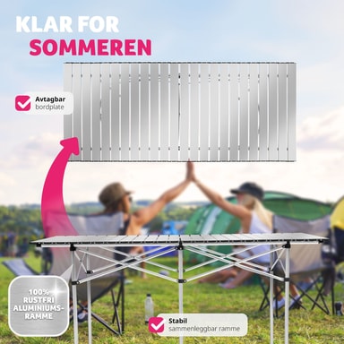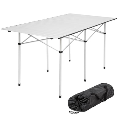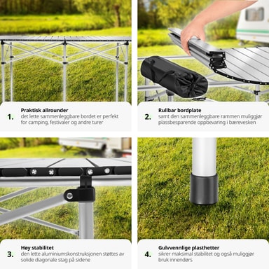 Dette praktiske aluminiumsbord er meget alsidigt. Hvad enten det er i haven, på stranden, på festivaller eller campingture, eller hvor der ellers kræves et bord, der er let at transportere og hurtigt klar til brug. Bordet kan klappes ud i en håndevending via et praktisk foldestel og overfladelamellerne. Bordet opbevares pladsbesparende i den medfølgende bæretaske, og er meget nemt at transportere.