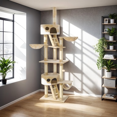 Dette kattetræ er udstyret med to rummelige kattehuse, hvor din kat kan trække sig tilbage og finde ro. Disse kattehuse er ideelle til at gemme sig, slappe af og sove. De tilhørende trapper gør det nemt for din kat at bevæge sig mellem niveauerne og finde sit perfekte hvilested.
