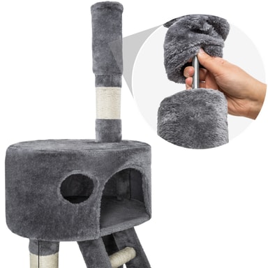 Dette kattetræ er udstyret med to rummelige kattehuse, hvor din kat kan trække sig tilbage og finde ro. Disse kattehuse er ideelle til at gemme sig, slappe af og sove. De tilhørende trapper gør det nemt for din kat at bevæge sig mellem niveauerne og finde sit perfekte hvilested.