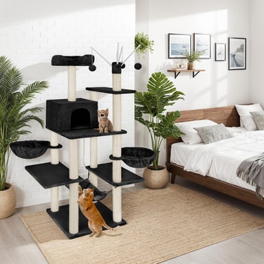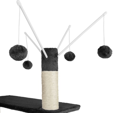 Søjlerne på dette kradsetræ er indtrukket med robust og modstandsdygtig sisal, hvilket giver din kat et ideelt sted at slibe sine kløer. Denne funktion beskytter ikke kun dine møbler mod ridser, men tilfredsstiller også din kats naturlige behov for at kradse. De forskellige platforme og niveauer på kradsetræet gør det også muligt for flere katte at benytte træet samtidig, hvilket gør det perfekt til hjem med flere katte.