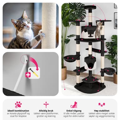 Kradsetræet er også dækket med naturligt sisal, som er ideelt til at vedligeholde dine kattes klør. Dette robuste materiale giver dine katte mulighed for at kradse og klatre uden at skade møblerne. Sisal er kendt for sin holdbarhed, hvilket gør dette kattetræ til et langtidsholdbart valg.
