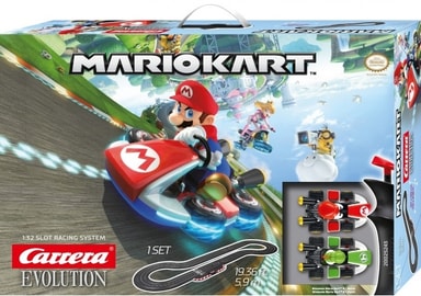 Analog bilbane i 1:32 skala med Mario og Yoshi i sine superkule karts. Banelengde på 5. 9m med kryssende veibaner og heftige langsletter.Læs mere om produktet