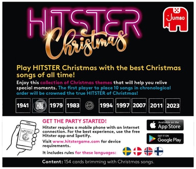 Jumbo Hitster Christmas Soundtracks kortspillet er et sjovt musik-fest kortspil med 300 populære julesange. Brug den medfølgende app til at scanne og afspille sange, og gæt derefter udgivelsesåret, kunstneren eller placer numrene på en tidslinje.Læs mere om produktet