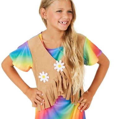 Kostume til børn, Blomsterbarn, består af en farverig kjole i spraglede regnbuefarver. Børnekostumet omfatter en fin, påsyet vest i velour-ruskindslook med frynser og blomsterpynt. Herudover hører der et skønt pandebånd og støvleskafter med til kostumet. Materiale: 100 % polyester.