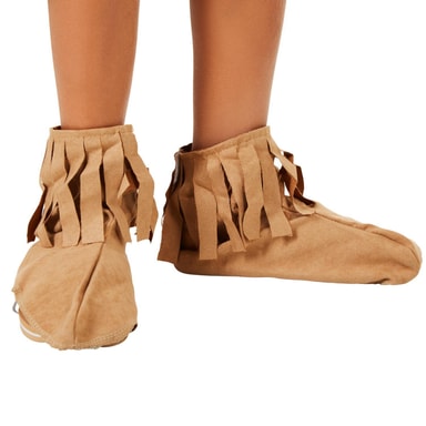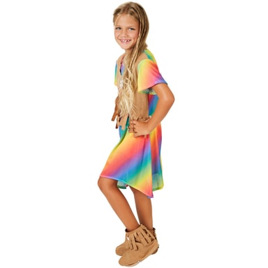 Kostume til børn, Blomsterbarn, består af en farverig kjole i spraglede regnbuefarver. Børnekostumet omfatter en fin, påsyet vest i velour-ruskindslook med frynser og blomsterpynt. Herudover hører der et skønt pandebånd og støvleskafter med til kostumet. Materiale: 100 % polyester.