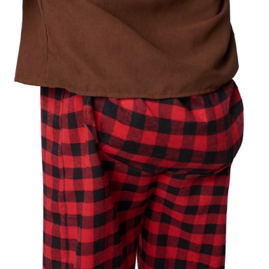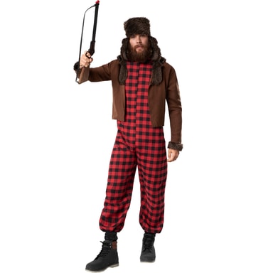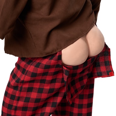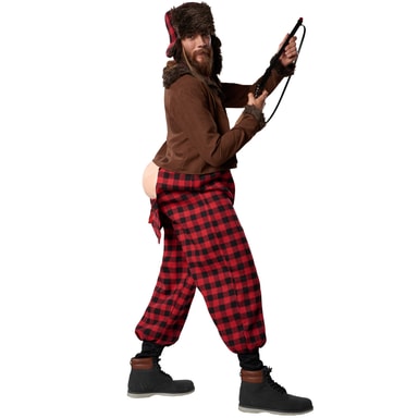 Herrekostumet, Bonderøv, består af et ærmeløst, rygfrit, ternet gevandt af fast stof. Hæle i fløjl er påsyet forneden på bukserne. På kraven er der anbragt en velcrolukning. Dertil hører en langærmet frakke af kunstlæder og en fake pelskrave.Læs mere om produktet