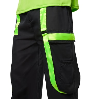 Mandekostumet, cool raver, består af et par lange bukser samt en overdel. Den ærmeløse shirt er fremstillet i neongrønt satinstof. På brystområder er der en påtrykt sort tribal print. De sorte bukser med svaj har elastiklinning-indsatser, knap, lynlås og bæltesnaller. Hvert bukseben har påsyede neongule striber på kryds og tværs. På det venstre bukseben er der en stor og lille sidelomme, materiale: 100% polyester.