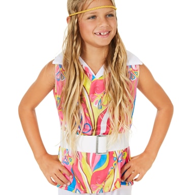 Kostume til børn, Dancing Girl består af en farverig top med disco-mønster. Hertil hører også et par hvide trompetbukser med elastik i taljen. Der kommer også bælte og hårbånd med. Materiale: 100 % polyester. I dette cool 70 'er fest-outfit bliver dit barn til en disco star! Helt i tråd med temaet, ""Saturday Night Fever"" vil cool piger være fantastisk udstyret til fastelavn! De farverige 70ere med Love, Peace og Happiness skaber også et dejligt humør til karnevallet. Din pige vil sikkert have det fantastisk sjovt med at genopleve 70erne i dette kostume. Som sød Flower Power girl vil hun have det gode humør med sig og danse til der kommer røg fra fødderne. Enhver pige vil føle sig super godt tilpas i dance kostumet. Altså: Afsted til fastelavnsdansegulvet.