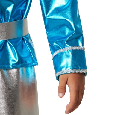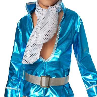 Drengekostumet, Disco dreng, består af tofarvet glans-stof. Den blå overdel har en sølvfarvet bort på den dybe halsudskæring samt en stående krave. Ærmerne med opslag har også en dobbeltradet pyntebort i sølv. På forsiden er blusen slidset lidt op i mavehøjde. De dertil passende bukser er lavet af sølvfarvet glans-stof og har en elastiklinning. Som typisk for disco-tiden har de brede ben. Kostumesættet indeholder derudover et sølvfarvet bælte med bæltespænde i metal-look samt et hvidt tørklæde med sølvtråde og sølvfarvede prikker, materiale kostume: 95% polyester, 5% elastan, materiale tørklæde: 100% polyester.