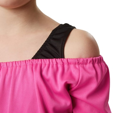 Pigekostumet, fitness-stjerne, består af en body, bukser, overdel og benvarmere. Den sorte body med lyseblå og hvide striber har en elastiklinning. De lyseblå, lange bukser er skåret figurbetonet og har ligeledes en elastiklinning. Den langærmede, pink overdel med elastisk udskæring er maveløs og bæres ovenpå bodyen. Benvarmerne i pink fuldender kostumet, materiale: 100% polyester.