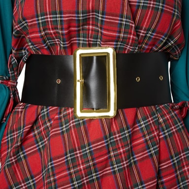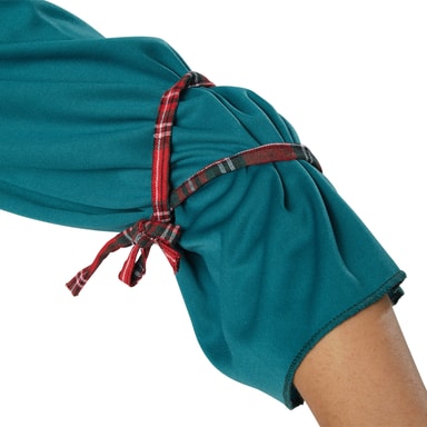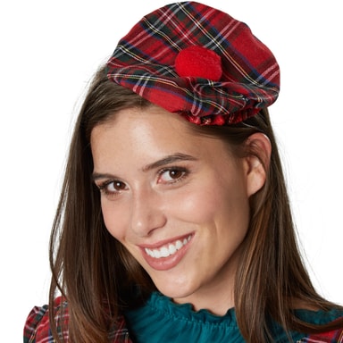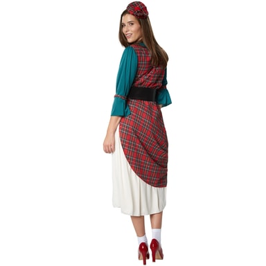 Det flerdelte kvindekostume fornem Highland-kvinde består af en ternet, ærmeløs overkjole, der er slidset og rynket i siden. Taljen er markeret optisk med en elastiklukning. Overdelen på heldragten er slidset asymmetrisk og dekolleté har en sammensyning. Det ensfarvede, lange underskørt er af satin ligesom den dertil hørende langærmede, ensfarvede bluse. Halsudskæringen virker let flæset takket være elastiklukningen. Ærmerne har for neden to bånd i samme ternede mønster som overskørtet. Knæstrømper, et sort bælte med guldspænde samt en miniature-hue, som sættes fast i håret med et spænde, er også inkluderet i leveringen, materiale: 100% polyester.