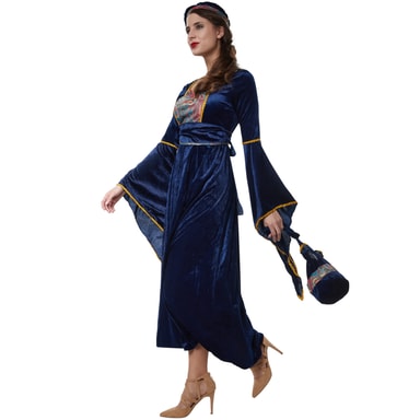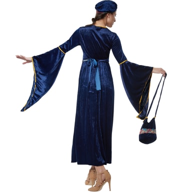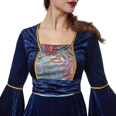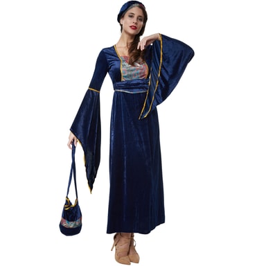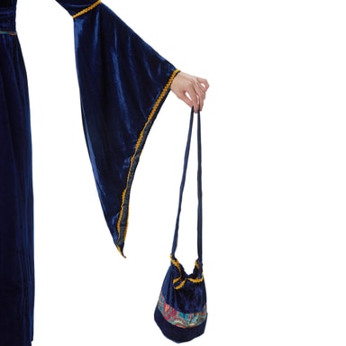 Kvindekostumet, fortryllende Borgfrøken, består af en ankellang kjole af mørkeblåt fløjl. De lange, vide og asymmetrisk tilskårne ærmer har en guldfarvet pyntebort i albuehøjde og på ærmekanten.Læs mere om produktet