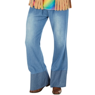 Kostumet til mænd, Hippie Peace, består af en cool, spraglet elastik-jersey t-shirt. Der kommer et par afslappede trompetbukser med elastiklinning i jeans-look med. En vest med frynser i velours-ruskindslook og et fedt pandebånd hører med som tilbehør og runder kostumet optimalt af.