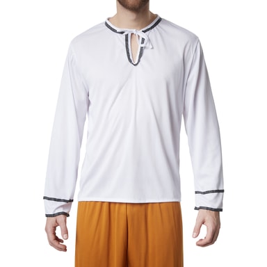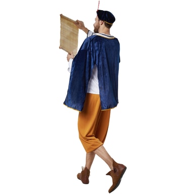 Det firdelte mandekostume, hoffolk, består af et par trekvartlange bukser af satin med elastiklinning og en langærmet satinskjorte med V-udskæring og et bindebånd. Rundt om kraven og foran på ærmerne er der påsyet pyntekanter med prikker. Kappen og hovedbeklædningen består af fløjl og har en guldfarvet pyntebort på kanten. Derudover er hovedbeklædningen udsmykket med en fjer, materiale: 100 % polyester.
