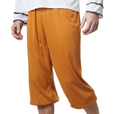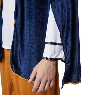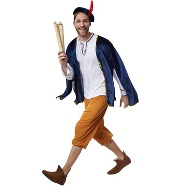 Det firdelte mandekostume, hoffolk, består af et par trekvartlange bukser af satin med elastiklinning og en langærmet satinskjorte med V-udskæring og et bindebånd. Rundt om kraven og foran på ærmerne er der påsyet pyntekanter med prikker. Kappen og hovedbeklædningen består af fløjl og har en guldfarvet pyntebort på kanten. Derudover er hovedbeklædningen udsmykket med en fjer, materiale: 100 % polyester.
