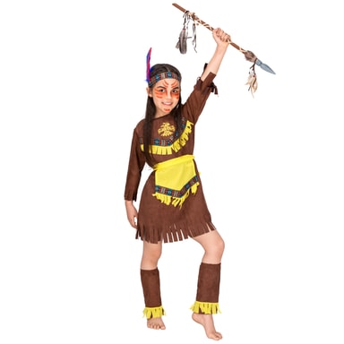 Kostume til børn, Indianerpigen Eagle Eye, består af en fortryllende kjole med mange frynser og borte i etnisk stil, alt sammen i veloursruskinds-look. Kjolen har lange ærmer og en lille selvklæbende båndlukning i nakken. Der kommer også et bindebælte med lomme-look, et elastisk pandebånd med fjer og benvarmere med elastik med. Materiale: 100 % polyester.