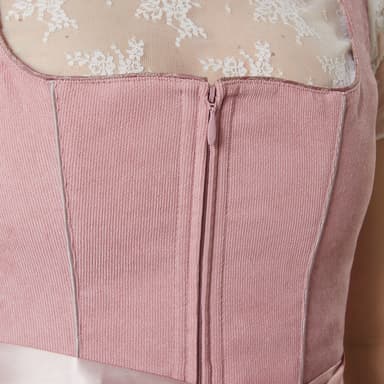 Den hjerteformede udskæring med den fine blondebluse skaber et elegant statement og fremhæver en smuk kavalergang. Livstykket er i gammelrosé og suppleres stilfuldt af skørtet i en skinnende sølvgrå. Den indarbejdede snøring i sløjfe-look ved taljen giver ikke kun et figursyet look, men kan tilpasses individuelt – for maksimal bærekomfort.