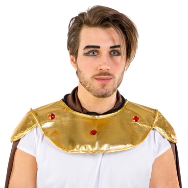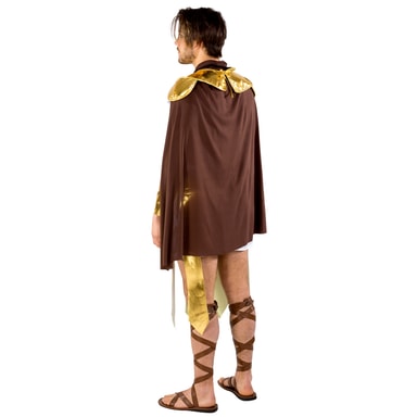 Kostume til mænd forestillende en mægtig gladiator omfatter en smart kjortel, en ædel kappe, en yndefuld, gylden krave til at binde manchetter med metal-look, og lukning, og et flamboyant bindebælte med metal-look. Materiale: 100 % polyester.