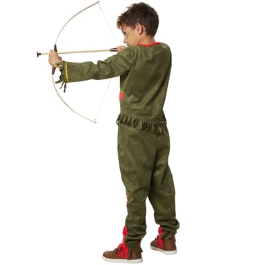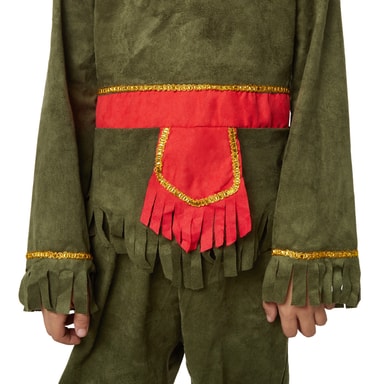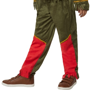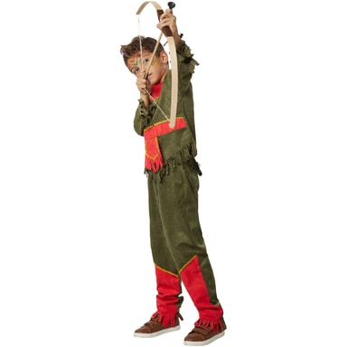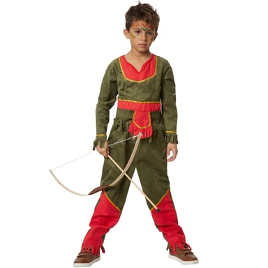 Drengekostumet, modig Mohikaner, i ruskinds-look består af et par lange bukser med elastiklinning og frynser forneden på buksebenene. Den nederste del af buksebenene har en stofindsats på forsiden, der afgrænses foroven af en guldfarvet bort. Overdelen ender ligeledes i et frynsemønster. Stofindsatserne med guldfarvede borter sidder i kraveområdet og på tværs i mavehøjde. I midten løber en stofindsats nedad og ender i et frynsemønster. De lange ærmer har også en guldfarvet bort foran og løber ud i frynsemønsteret, materiale: 100 % polyester.