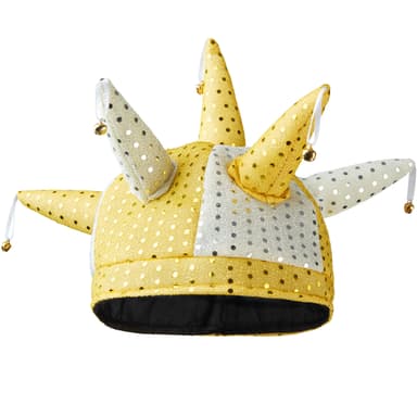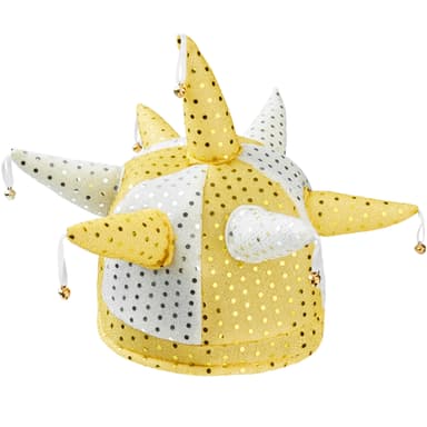 Kling... lille klokke.... kling: Man kan allerede kende narhattens ejer på lyden af klokker. Desuden er den et rigtigt blikfang med sine hvid-gyldne farver, fire glitrende prikker og de syv horn. Med narhatten med små klokker kommer vil det gå vildt til og være klangfuldt.