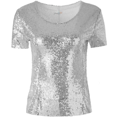 Den yndige kortærmede paillet T-shirt vil være førstevalget til et glamourøst look. Ved lysindfald eller bevægelse funkler og glitrer de utallige, tynde små plader på forsiden og på de korte ærmer fortryllende i flere lag. Takket være det elastiske materiale er den let taljerede kvinde top med rund halsudskæring behagelig at have på, materiale: 100 % polyester.