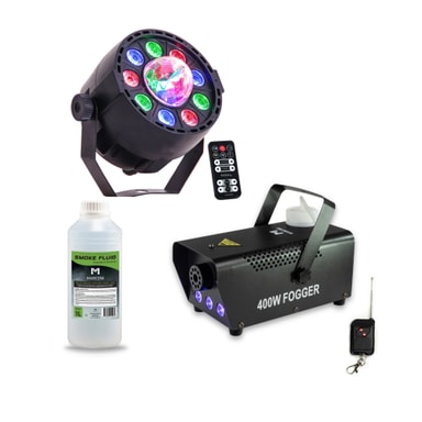 Dette bundle består af 1 x LED PAR-ASTRO 2-i-1 Diskolys, 1 400W RGB Røgmaskine samt 1L røgvæske.
