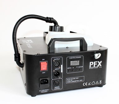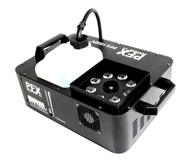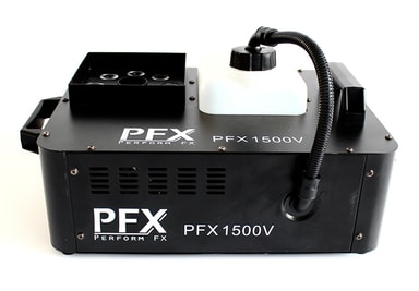 Pfx1500v er en kraftfuld vertikal røgmaskine, der skyder en kraftig eksplosion af røg op i luften, op til 8 meters højde. dette giver en co2 lignende effekt, især når der anvendes ""co2"" røgvæske. med 8 x 3 watt led rgb dioder der kan ""farve"" røgen. pfx1500v leveres med en trådløs fjernbetjening, der har en rækkevidde op til 25 meter. brugeren kan tage fuld kontrol over røgmaskinen med en 2 kanals dmx controller. denne vertikale røgmaskine kan anvendes på forskellige måder, på gulvet, eller hænge den i alutruss'en over folk eller skyde røgen ud fra siden af scenen. Kort sagt med denne maskine har du masser af muligheder for at lave vilde effekter med røg. anvendelsen af maskinen ved ophæng: der fjernes de 2 metalplader og skift af placering på væsketanken. der er tre m8 gevindskårne huller til truss clamps.