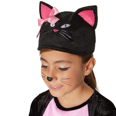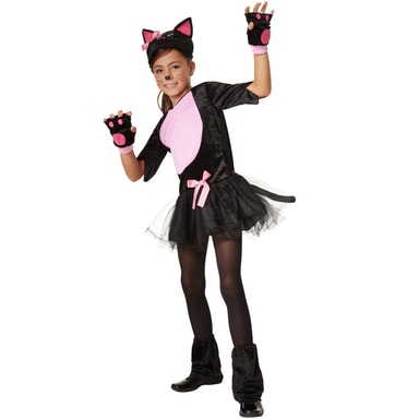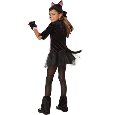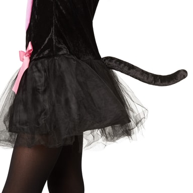 Det søde pigekostume pink fløjlspote består af en kort kjole med en nederdel i dobbelte lag af tyl og satin. Der er syet en lille, rosa sløjfe på nederdelen. Overdelen består af sort plysstof med en rosafarvet indsats ved maven og brystkassen. Ærmerne er frynsede. Kjolen lukkes på ryggen med en lynlås. For enden af lynlåsen sidder en kattehale med et bøjeligt stykke ståltråd indeni. Den sorte kattehue har ører og ansigt. Indersiden af ørerne, næsen og sløjfen er holdt i rosa. Sorte benvarmere samt sorte, fingerløse plyshandsker med rosafarvede påsyede poter og rosa bånd komplementerer kostumet, materiale: 100% polyester.