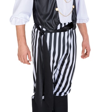 Kostume til mænd, Piratkaptajn Brysk, består af bukser i Jersey Stretch-stof med elastiklinning og integrerede benvarmere med støvle-look. Benvarmerne har en elastik forneden til at holde dem fast på skoene. Hertil kommer der en elegant overdel i Stretch Jersey-stof med en lille lukning i nakken. Foran har piratkostumet en påsyet flæsekrage og knapper til pynt. Der medfølger også en rødt bandana og et sort bindebælte . Materialet er 100 % polyester.