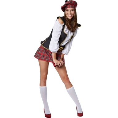Kvindekostumet skotte-pige består af en kort nederdel af ternet stof med elastik i taljen. Den hvide bluse har flæser på kraven og ærmerne og er også med elastik. Den sorte vest er uden ærmer med lange skulderkapper.Læs mere om produktet