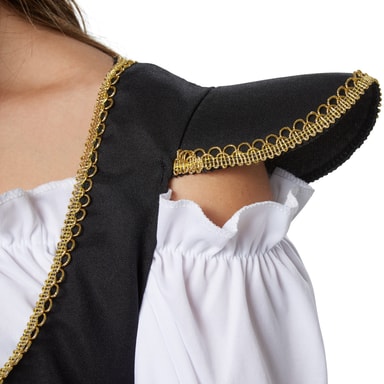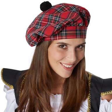 Kvindekostumet skotte-pige består af en kort nederdel af ternet stof med elastik i taljen. Den hvide bluse har flæser på kraven og ærmerne og er også med elastik. Den sorte vest er uden ærmer med lange skulderkapper. Hele vestens sømkant har en gylden bort. Det sorte bælte med guldspænde, de passende knæstrømper samt huen i skotskternet look med kvast afrunder kostumet, materiale: 100% polyester.