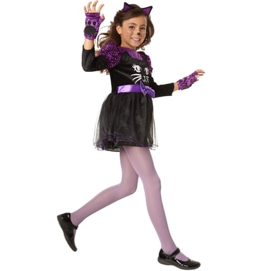 Det vidunderlige pigekostume, sød krammekilling, besnærer især med sit detaljerige og legende look. Det er en kjole i én del med en nederdel i tre lag af tyl og satin, hvor de to øverste tylskørter har en lilla søm. Den omhyggeligt forarbejdede overdel med lange ærmer består hovedsagelig af sort fløjl og er på forsiden formet som et kattehoved, med øjne, næse og knurhår påtrykt i hvidt. Det øverste område adskilles fra nederdelen af et påsyet bånd med en butterfly i lilla. Området ved brystudskæringen har en lilla stofindsats med pink prikker. Skulderområdet på begge sider er af lilla fløjl med sølvprikker. Ærmerne er af sort plys. Kostumet lukkes på ryggen med en lynlås. For enden af den sidder en kattehale med et indarbejdet bøjeligt stykke ståltråd til individuel formgivning. Kostumet komplementeres af de fingerløse handsker og tilbehør til hår med katteører. Den handskerne er lilla med sølvfarvede strålende prikker og sorte påsyede poter, materiale: 100% polyester.