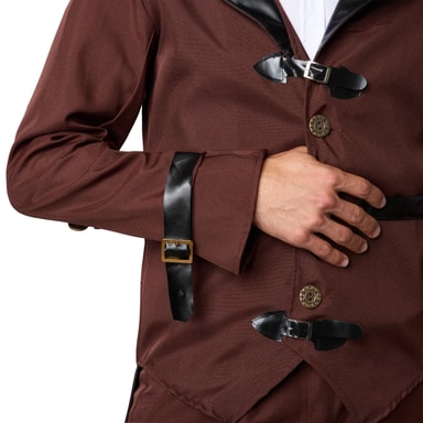 Herrekostumet, Steampunk Greve, består af et par lange bukser og en langærmet skjorte, der kan knappes. Kjolesættet har både knapper og bæltespænder. De antydede lommer, kravemanchetten og svalehalen har en indsats i kunstlæder.Læs mere om produktet