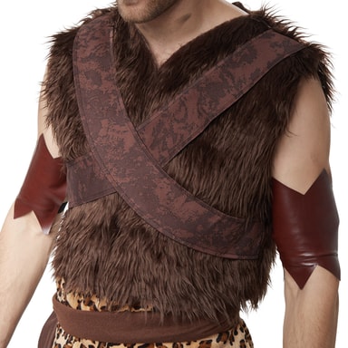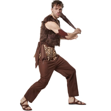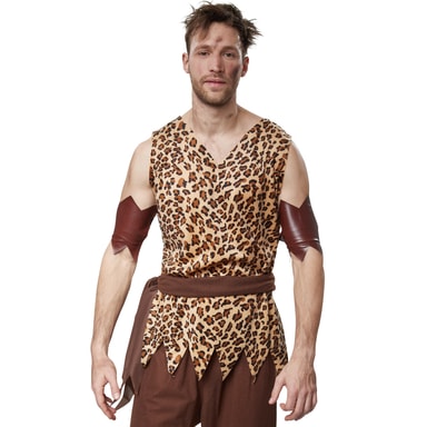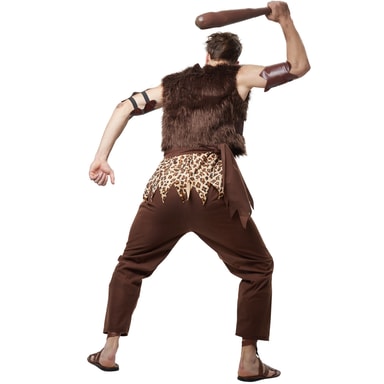 Mandekostumet, stenaldermand, består af shirt, slipover, bukser samt bindebælte og armmanchetter. Shirt og slipover er ærmeløse. Denne shirt er lang, har et leopardmønster og et takket snit forneden. Slipoveren, der bæres herover, har kunstpels og to remme i ruskindslook, der løber diagonalt hen over forsiden. Bukserne er lange og har elastiklinning. Et bredt bindebælte og to armmanchetter med elastikbånd er også inkluderet, materiale: 100 % polyester.