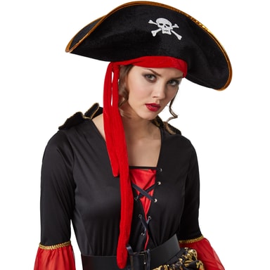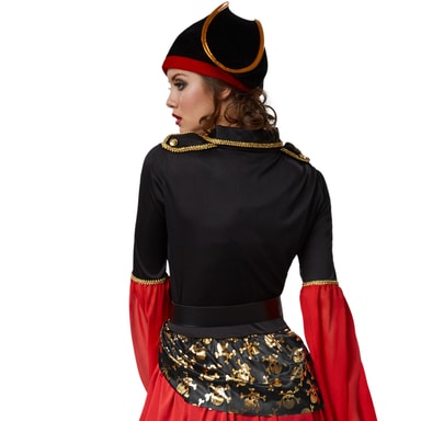 Damekostumet, Piratdronning, består af en kjole med snøre, en sørøverhat med rødt bånd og et bælte.