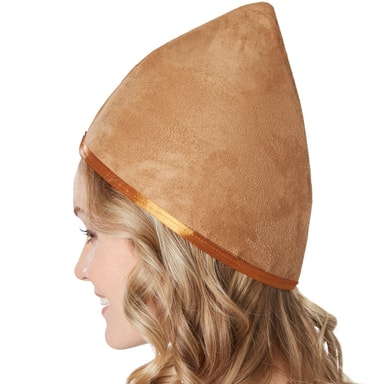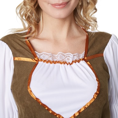 Kvindekostumet, tyvenes dronning, består af en kort kjole og en hat. Kjolen er hvid med grøn-blå indsatser i velour og en brun satinsøm på krave, arme, forklæde og nederdelens søm. Forneden på ryggen er der anbragt en elastikbånd. Kjolens nederdel er kort foran og lang bagpå. Det korte underskørt er af tyl. Den påsyede kittel-del oven for forklædering løber ud i et mønster. Foran på maven er antydningen af en snøre. Den lige halsudskæring er pyntet med en blondebort. De lange ærmer har en afslutning i velour, er slidset op i siderne og har et elastikbånd på overarmen. Den spidse hat af velour med satinsøm afrunder kostumet, materiale: 100% polyester.