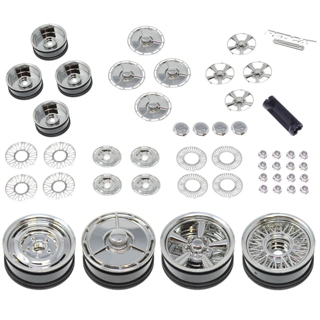 4 Tønder 4 Lager-stil hjulkapsler 4 Mag stil indsatser 4 Skær i stålstil 4 Indre eger indsatser, 4 ydre eger indsatser, 4 center hætter 16 Låsemøtrikker Hjulværktøj Redcat plakette Klistermærkeark