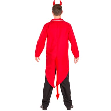 Kostume til mænd bestående af en ærmeløs tætsiddende bluse med påsyede fluer, en fin jakke med påsyet djævlehale, et par fine bukser og et par djævlehorn. Materiale: 100 % Polyester.
