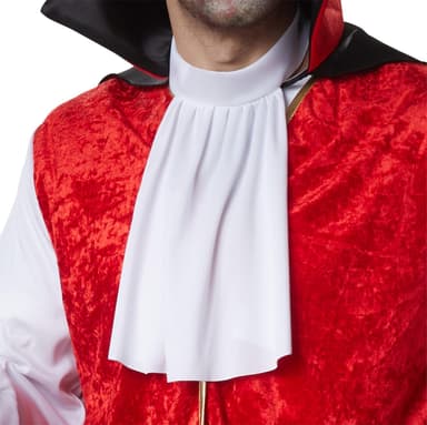 Mandekostumet, fornem Vampyr, består af fire dele. De lange bukser er af satinstof og har en elastiklinning. Overdelen af fløjl har pynteknapper og lukkes med velcro. Kanten er markeret i guld og på bagsiden holdt i et svalehale-mønster.Læs mere om produktet