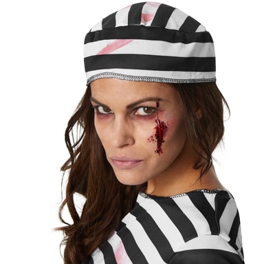 Kvindekostumet, Skræmmende fange-brud, passer perfekt til Halloween og har sort-hvide striber. Sømmen på skørtet og ærmerne trævler. Kostumet har masser af blodpletter. Tøjet falder ned langs figuren. Knæstrømper og hue fuldender outfittet. Materiale: 100% polyester.