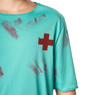 Drengekostumet, skræmmende læge, består af en kortærmet trøje i grøn med et rødt kors-print på venstre side af brystet. Kostumet er helt perfekt udklædning til Halloween. Bukserne til er holdt i samme farvetone og ligesom overdelen også plettet med blod. Der er hold i bukserne takket være elastikken i linningen. Den inkluderede lægehat, også plettet af blod, komplementerer det vellykkede kostume, materiale: 100% polyester.