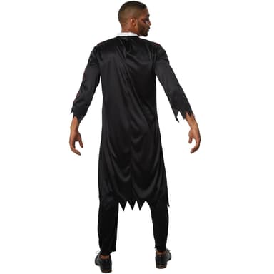 Herrekostumet, skræmmende præst, til Halloween består af tøj med takket mønster forneden og et par lange bukser. På den opretstående krage er der en lynlås i nakken. På skuldrene er der syet røde bånd fast, som holder stolaen fast.Læs mere om produktet