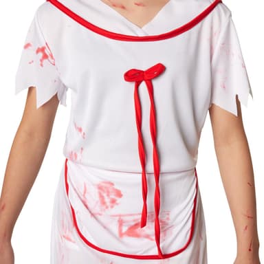Pigekostumet, skræmmende sygeplejerske, består af en del med en kjole i hvid og rød. Dette kostume passer perfekt som udklædning til Halloween. Kostumet er frynset på de korte ærmer og på skørtets søm. Der er en rød bort op kjolens krave.Læs mere om produktet