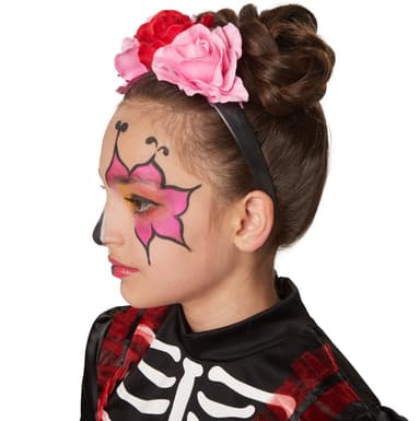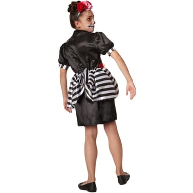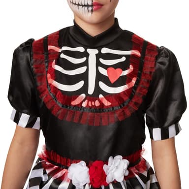 Pigekostumet, skeletdame ,er med korte ærmer med skelet-påtryk i brystudskæringen, langs-liggende krave og sort-hvid stribet ærmekant. Kostumet passer perfekt til Halloween. Rundt om skelet-påtrykket er der en blondebort af rød tyl. Røde og hvide påsyede blomster danner et bælte i taljen. Det korte overskørt, der er rynket i siderne og slidset fuldstændig op foran og bagpå, er lavet af sort-hvidt stribet stof. Kjolen lukkes midt på ryggen med en lynlås. Et hårbånd med røde og rosafarvede roser er også inkluderet, materiale: 100% polyester.