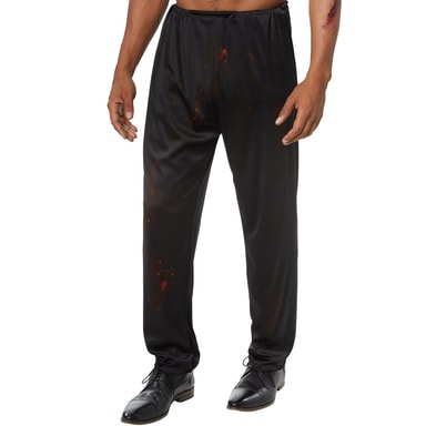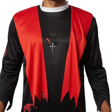 Herrekostumet, skræmmende præst, til Halloween består af tøj med takket mønster forneden og et par lange bukser. På den opretstående krage er der en lynlås i nakken. På skuldrene er der syet røde bånd fast, som holder stolaen fast. Overalt på tøjet er der blodpletter i forskellige størrelser. En kæde med kors fuldender kostumet. Materiale: 100 % polyester.